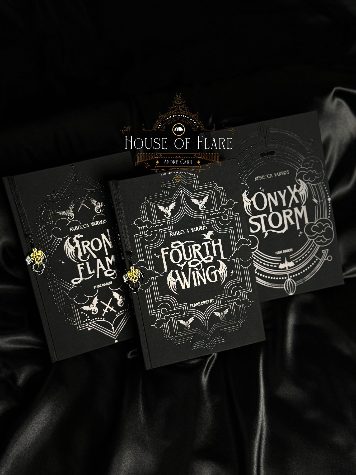 Step into the world of Basgiath with the Obsidian Dragons tutorial, a striking rebind of the 3-book series. Each of the three volumes is cloaked in deep black book cloth, detailed with black foiled designs, and finished with black sprayed edges that feel like shadows. The set is completed with black and gold dragon charms!