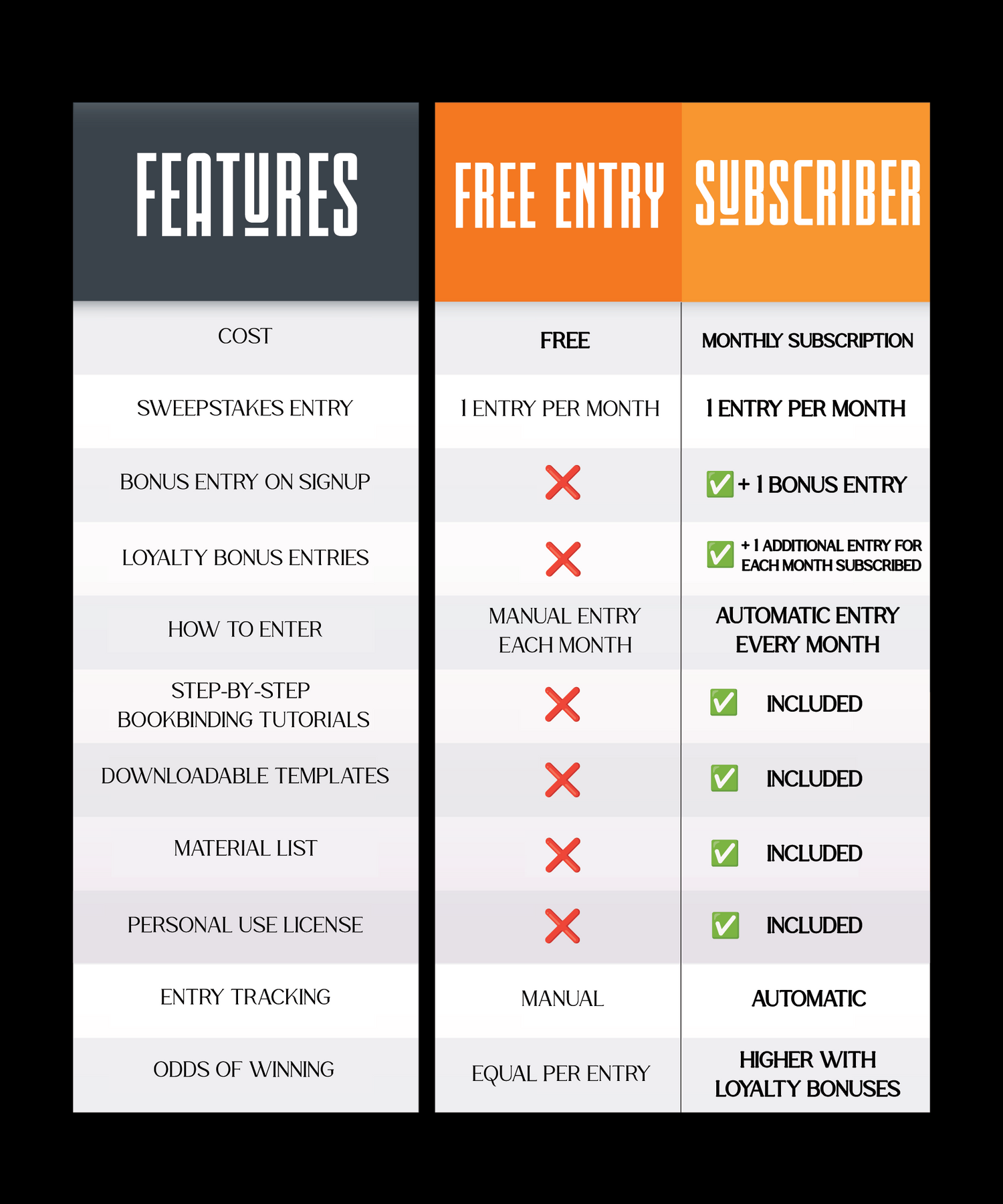 Free entries are available and only count as 1 entry and must be manually entered every month. But subscribers enjoy automatic entries, bonus entries, and loyalty perks each month.
