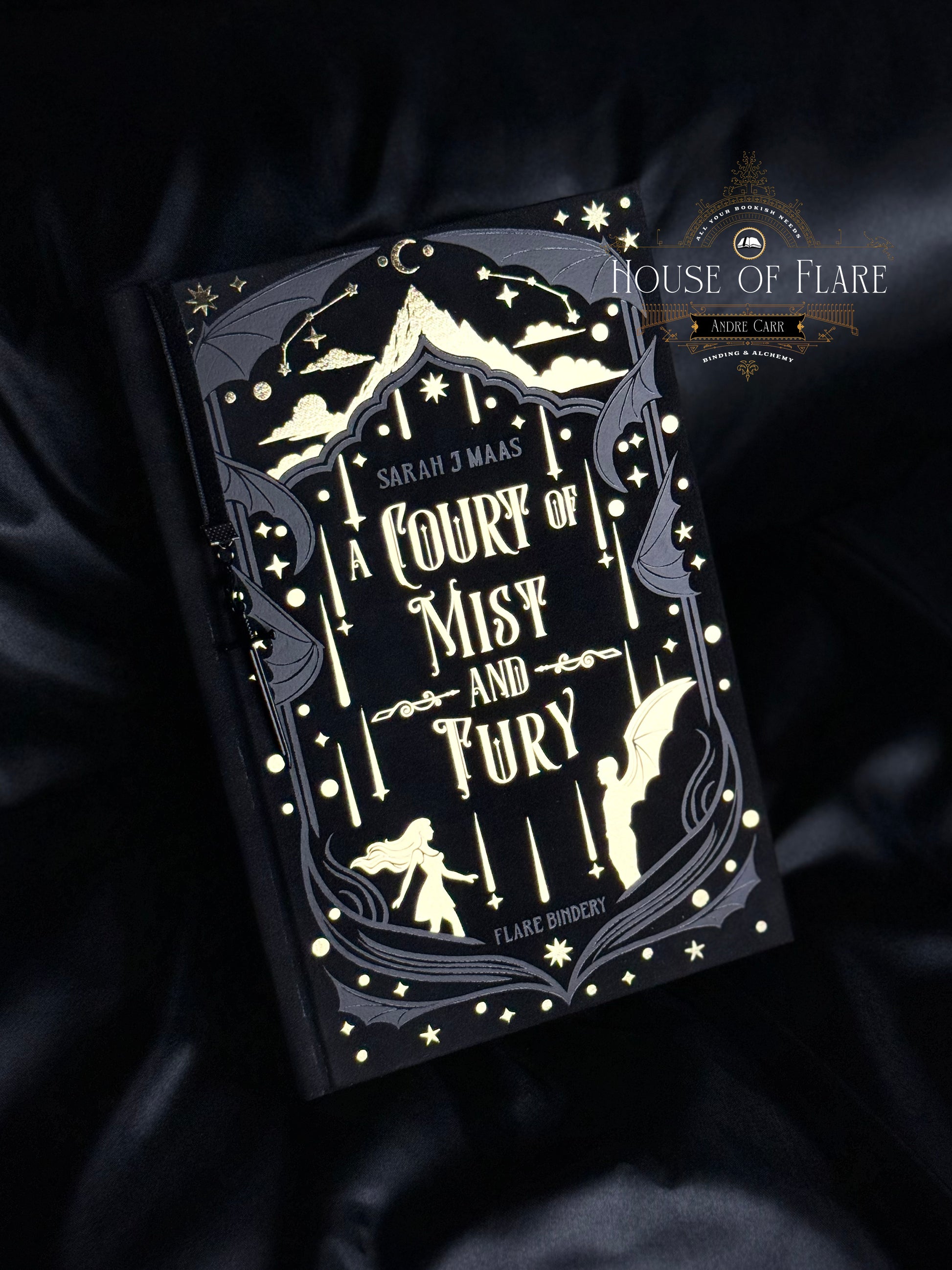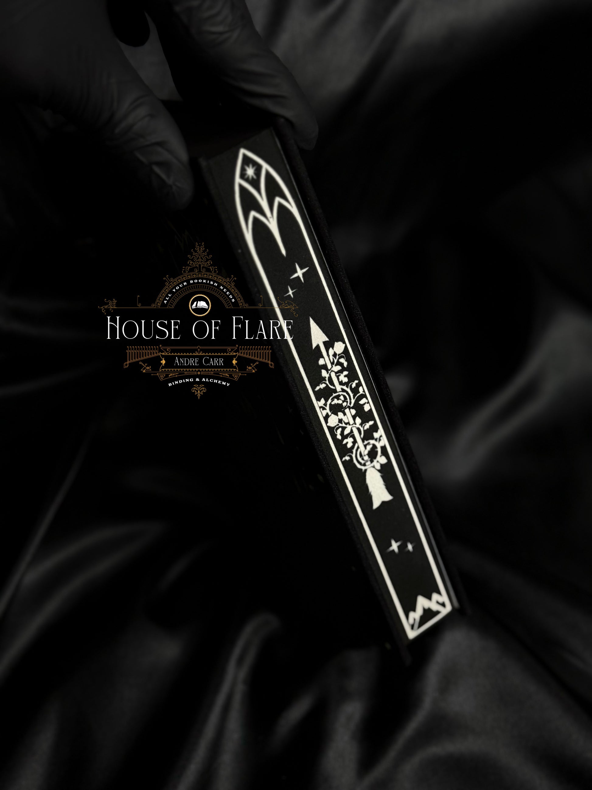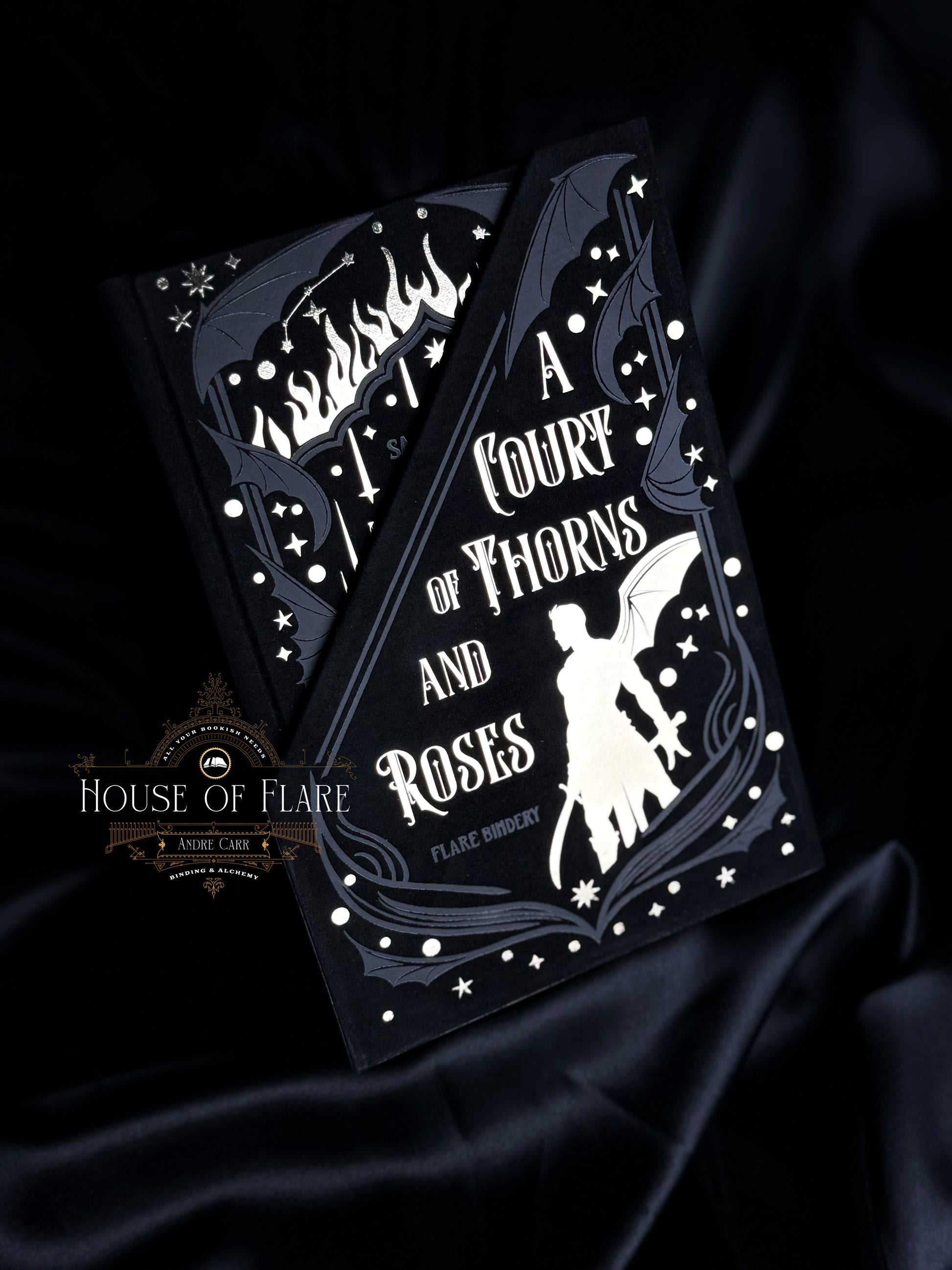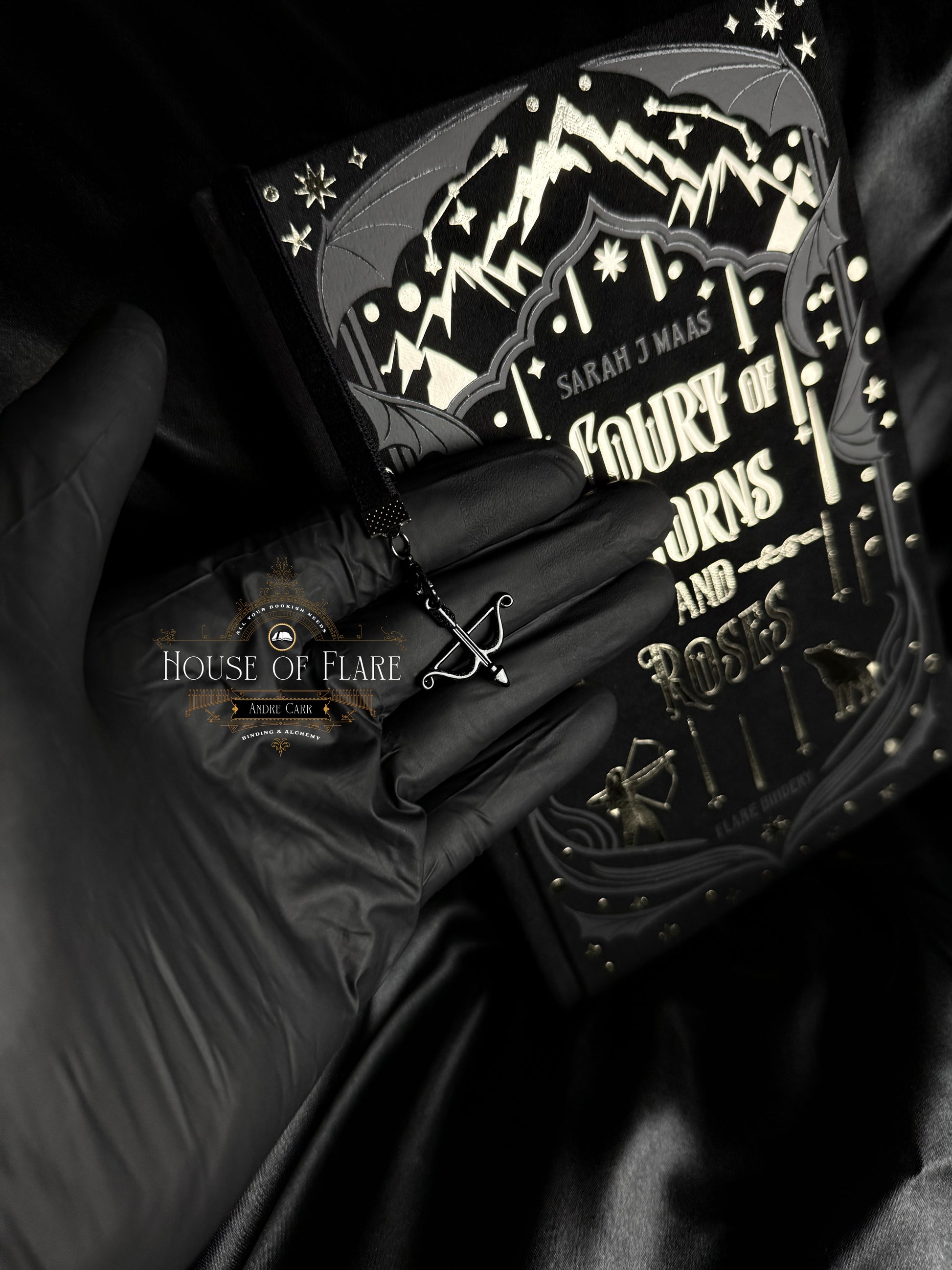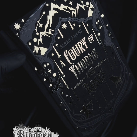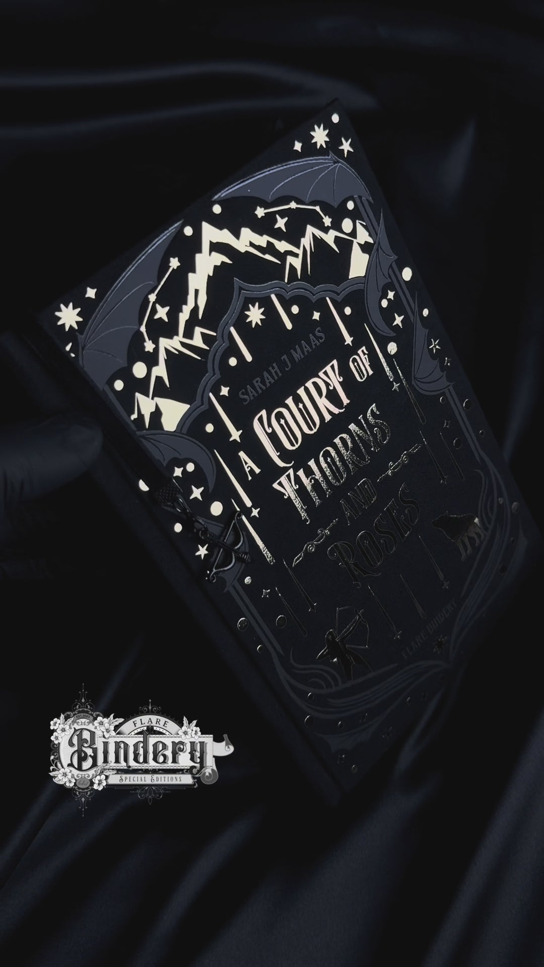 Step into Prythian with this Nightfall Edition rebind of A Court of Thorns and Roses. Bound in luxurious black suede book cloth, featuring black sprayed edges with an intricate design and a matte BLACKISH GRAY HTV cover design accented in GOLD foil. Each book includes a built-in black suede ribbon bookmark with a matching black charm.