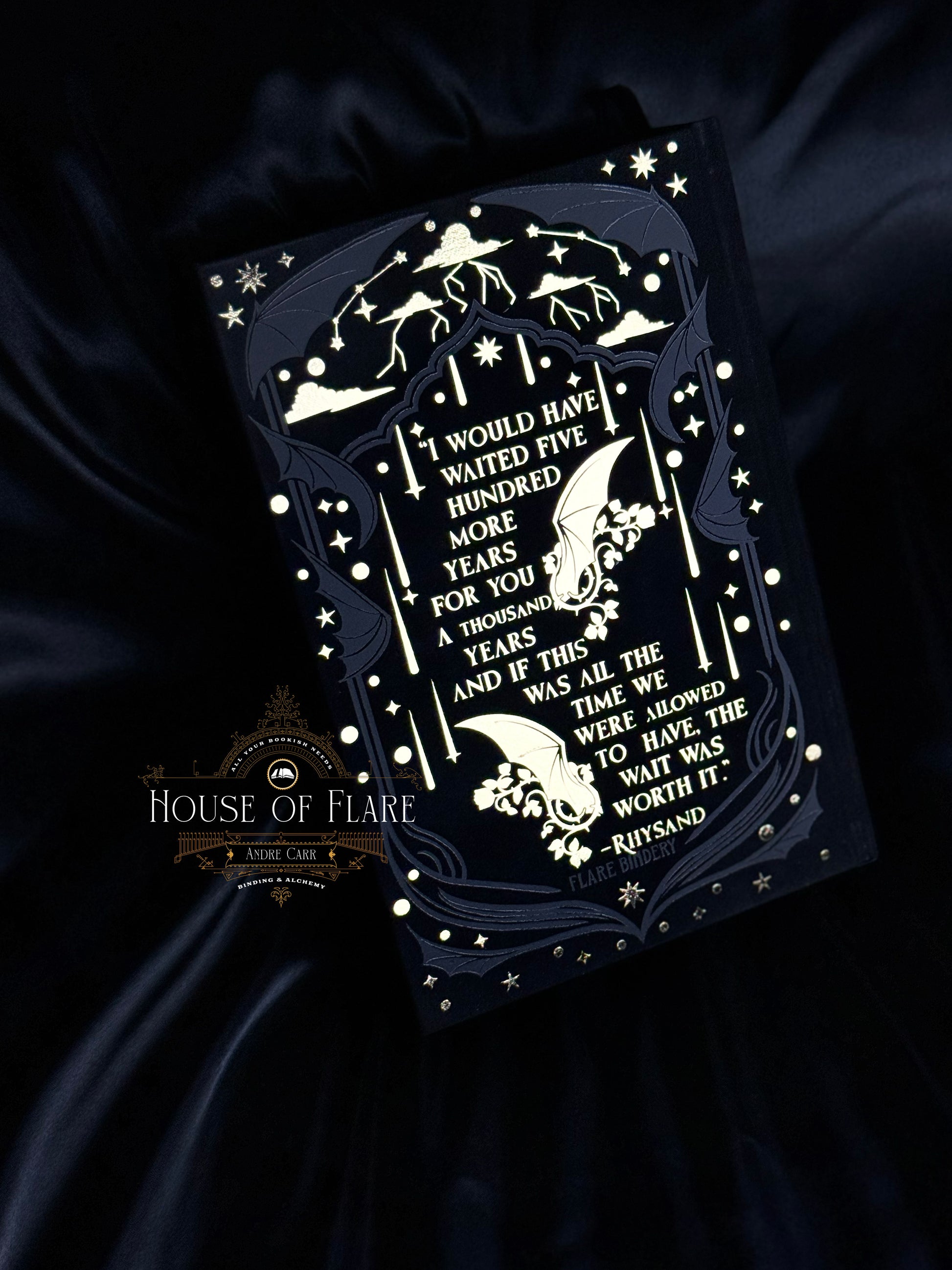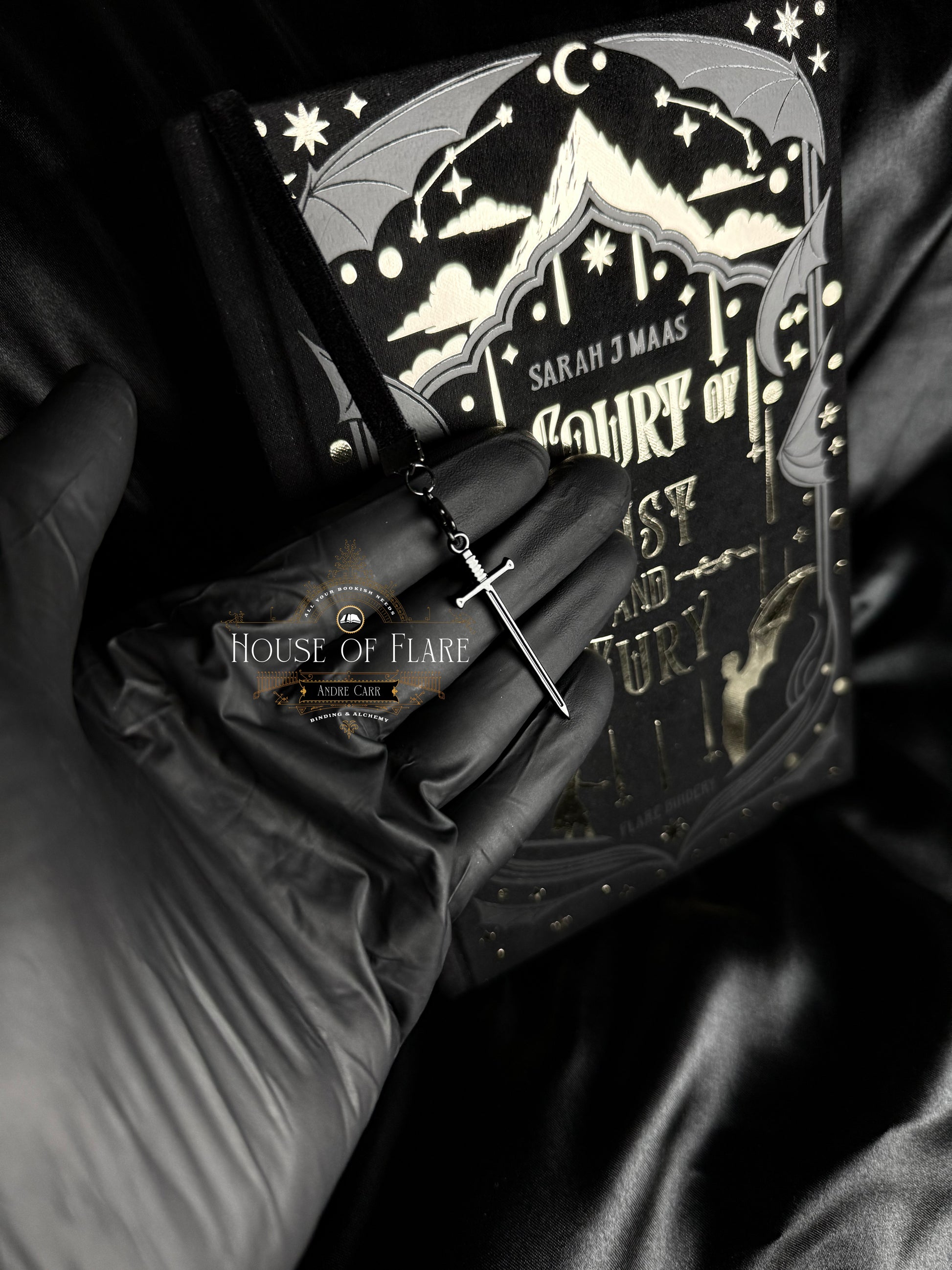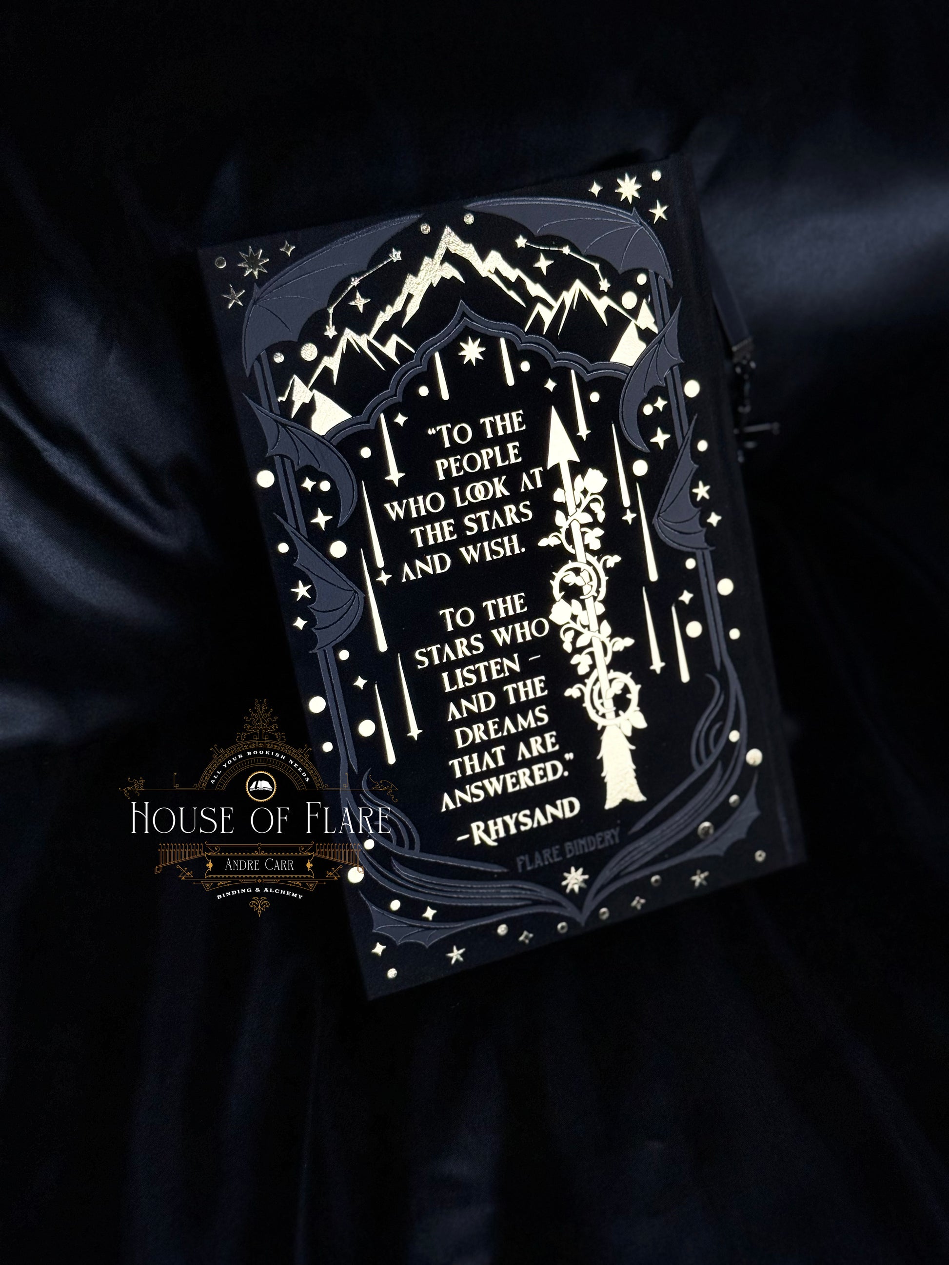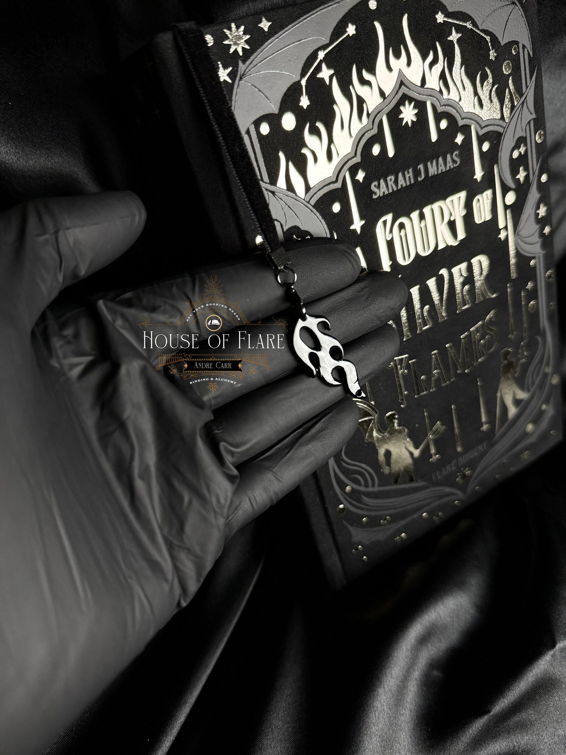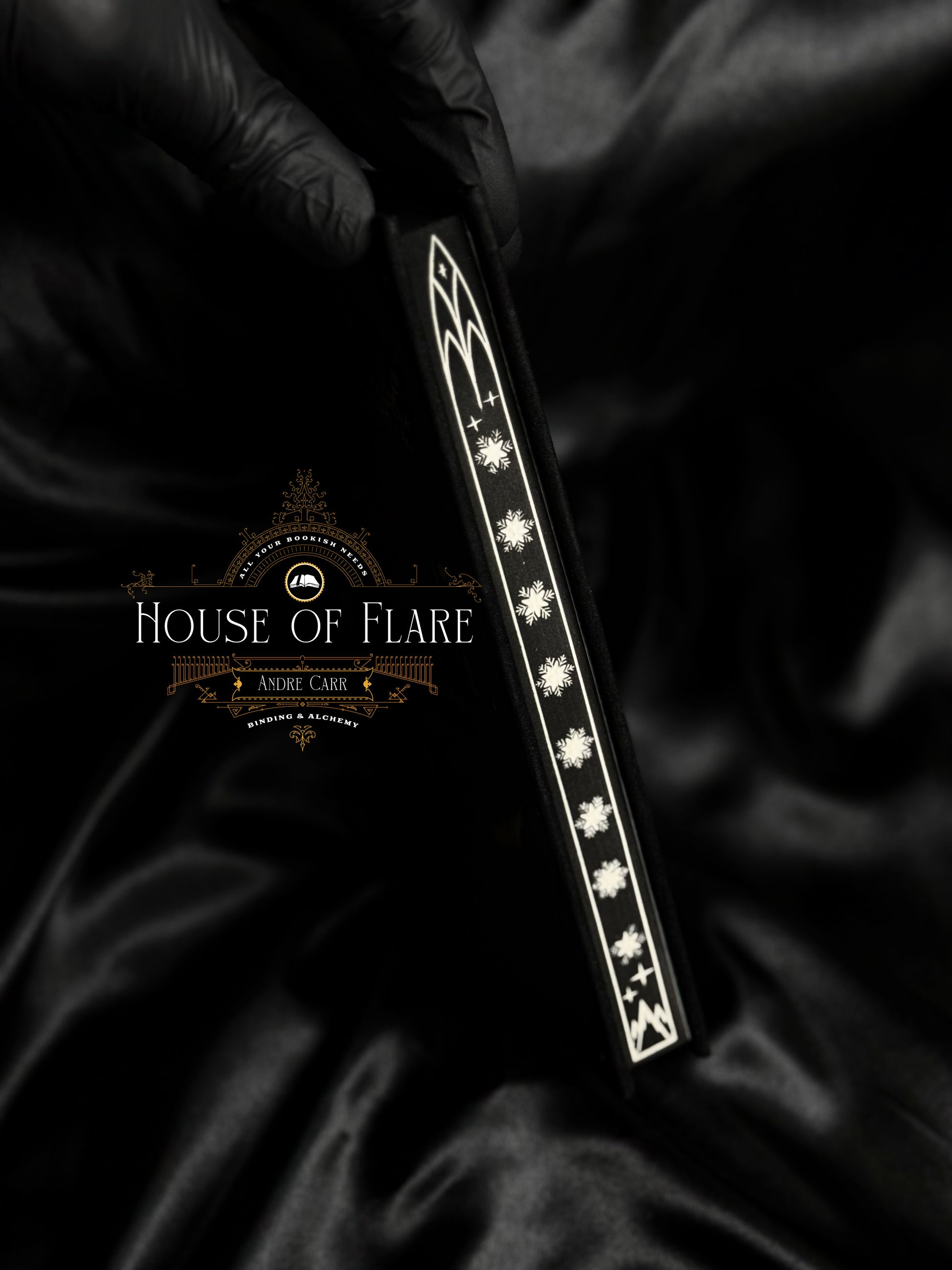 Step into Prythian with this Nightfall Edition rebind of A Court of Thorns and Roses. Bound in luxurious black suede book cloth, featuring black sprayed edges with an intricate design and a matte BLACKISH GRAY HTV cover design accented in GOLD foil. Each book includes a built-in black suede ribbon bookmark with a matching black charm.
