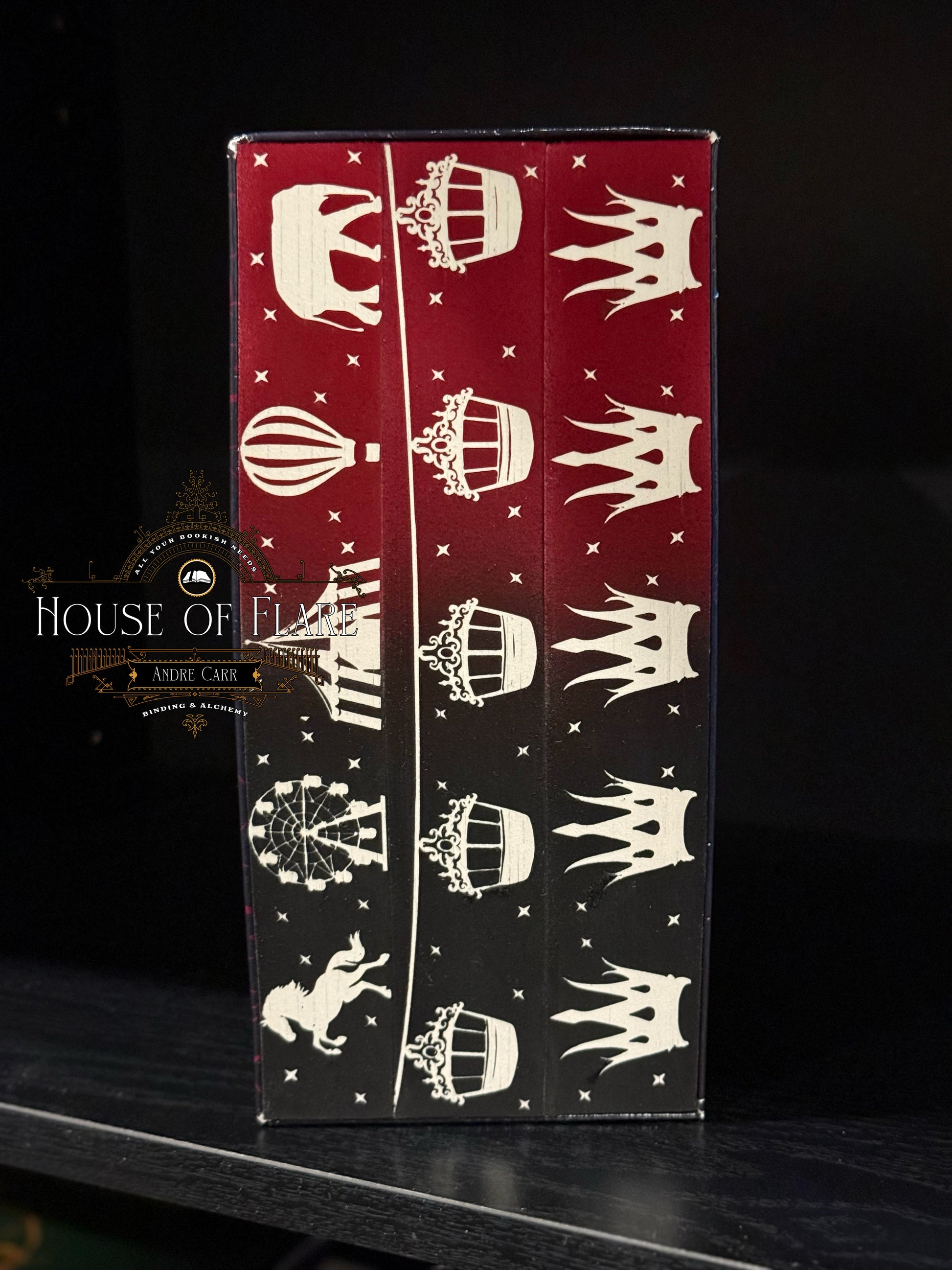 Each book—Caraval, Legendary, and Finale—features hand-painted sprayed edges with intricate circus-inspired designs unique to each volume, blending seamlessly from deep maroon to velvety black. The designs create a mesmerizing panoramic effect when the set is stacked together, evoking the enchanting aesthetic of the Caraval stage.
