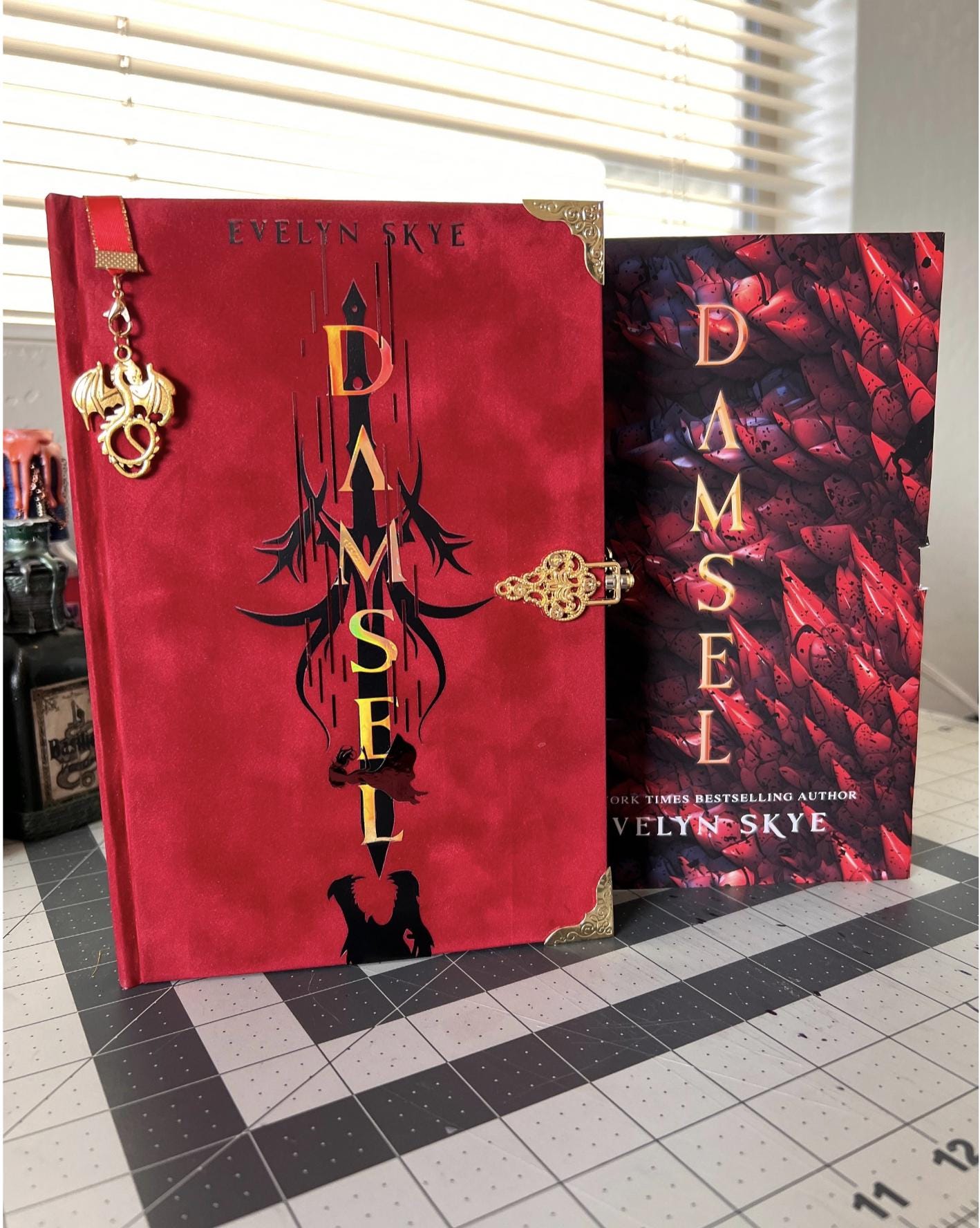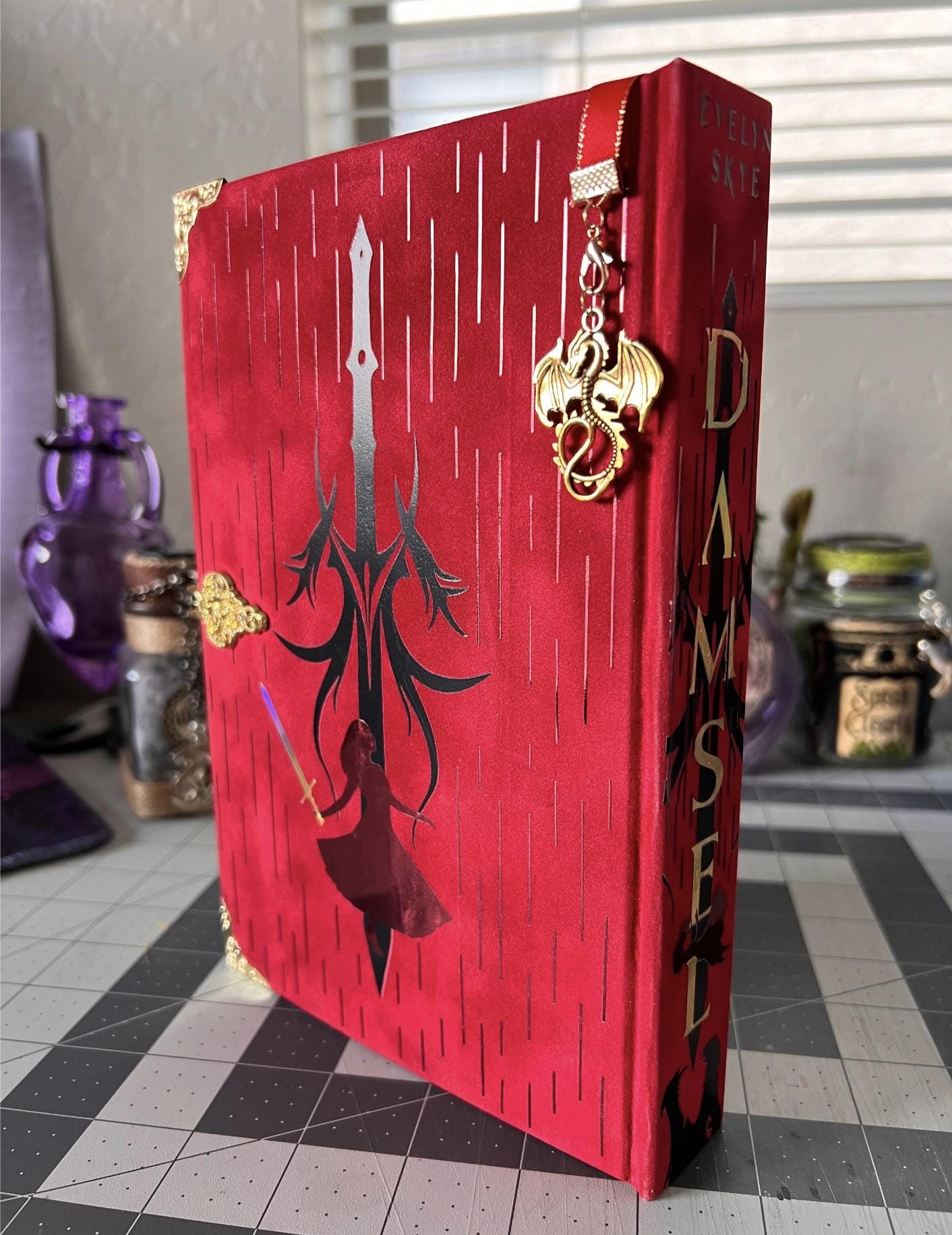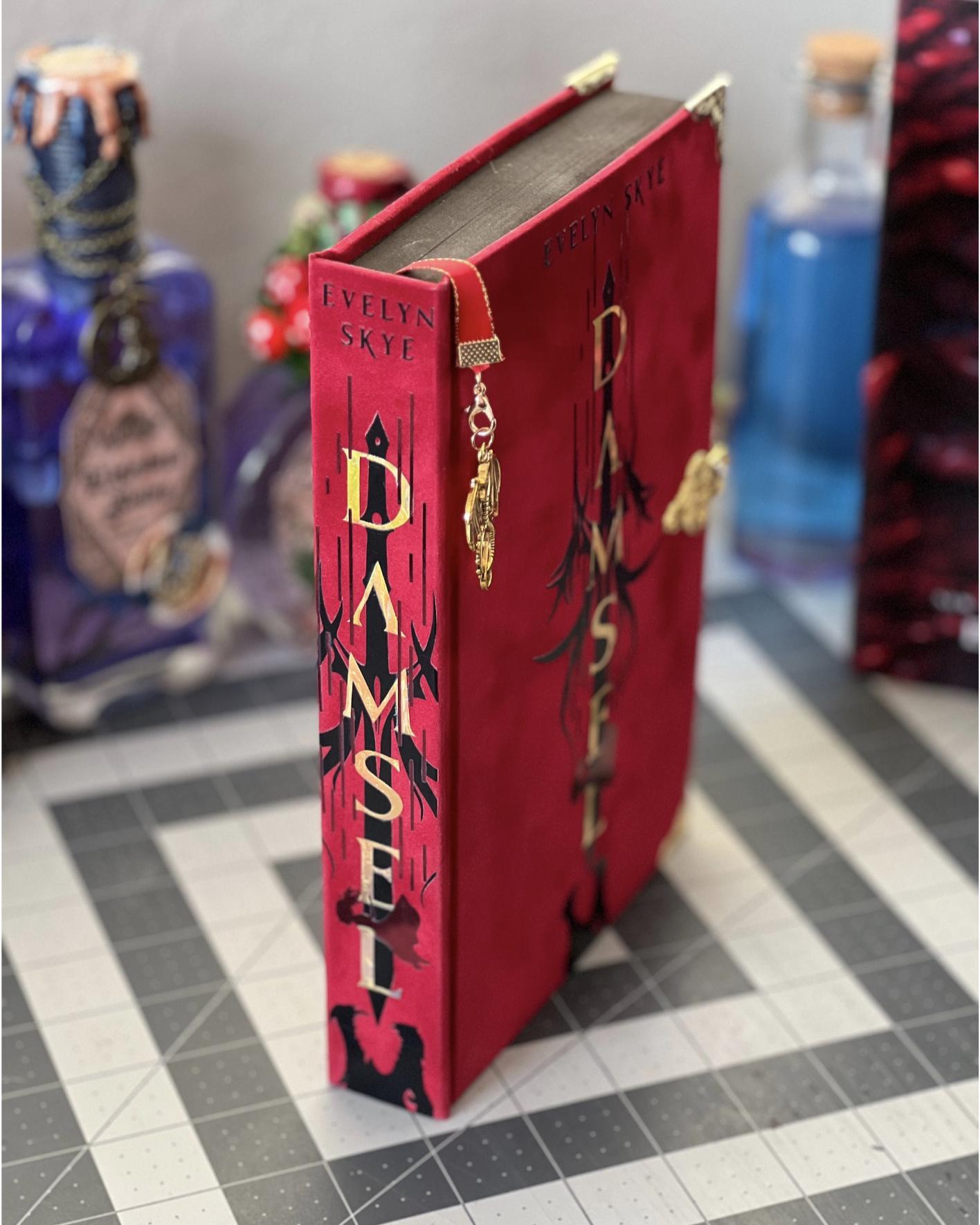 Damsel Rebind in Ruby red suede book cloth, golden book clasp, and custom endpapers with dust jacket.
