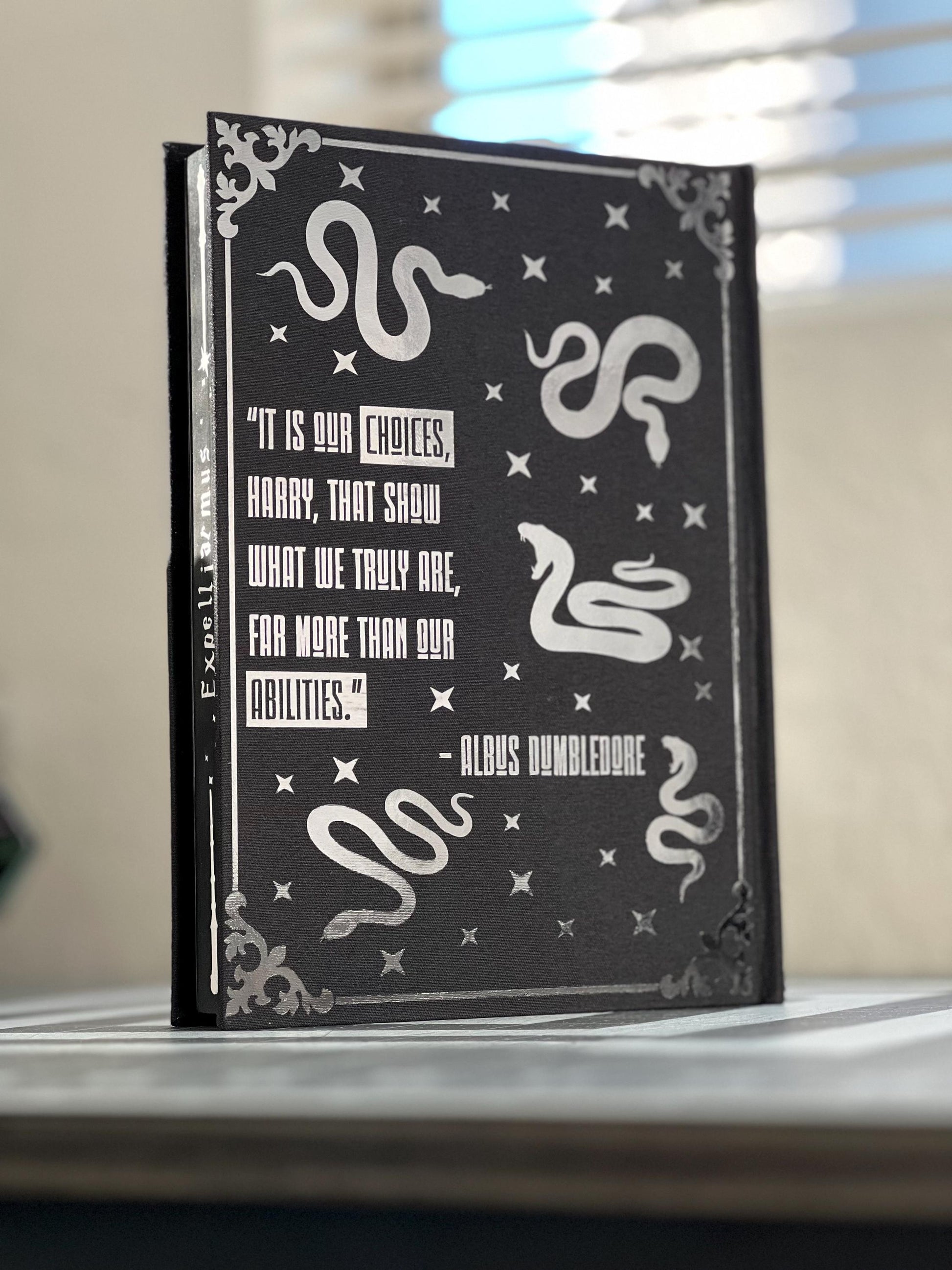 Immerse yourself in the wizarding world with this hand-bound, custom edition of Harry Potter and the Chamber of Secrets , part of the Serious Black Collection. Designed in a striking, pure black aesthetic, this rebind features black book cloth and a black foiled cover design. The book includes a built-in bookmark adorned with black charms inspired by the series, black foiled endpapers, and black sprayed page edges inscribed with iconic spells from the Harry Potter universe.