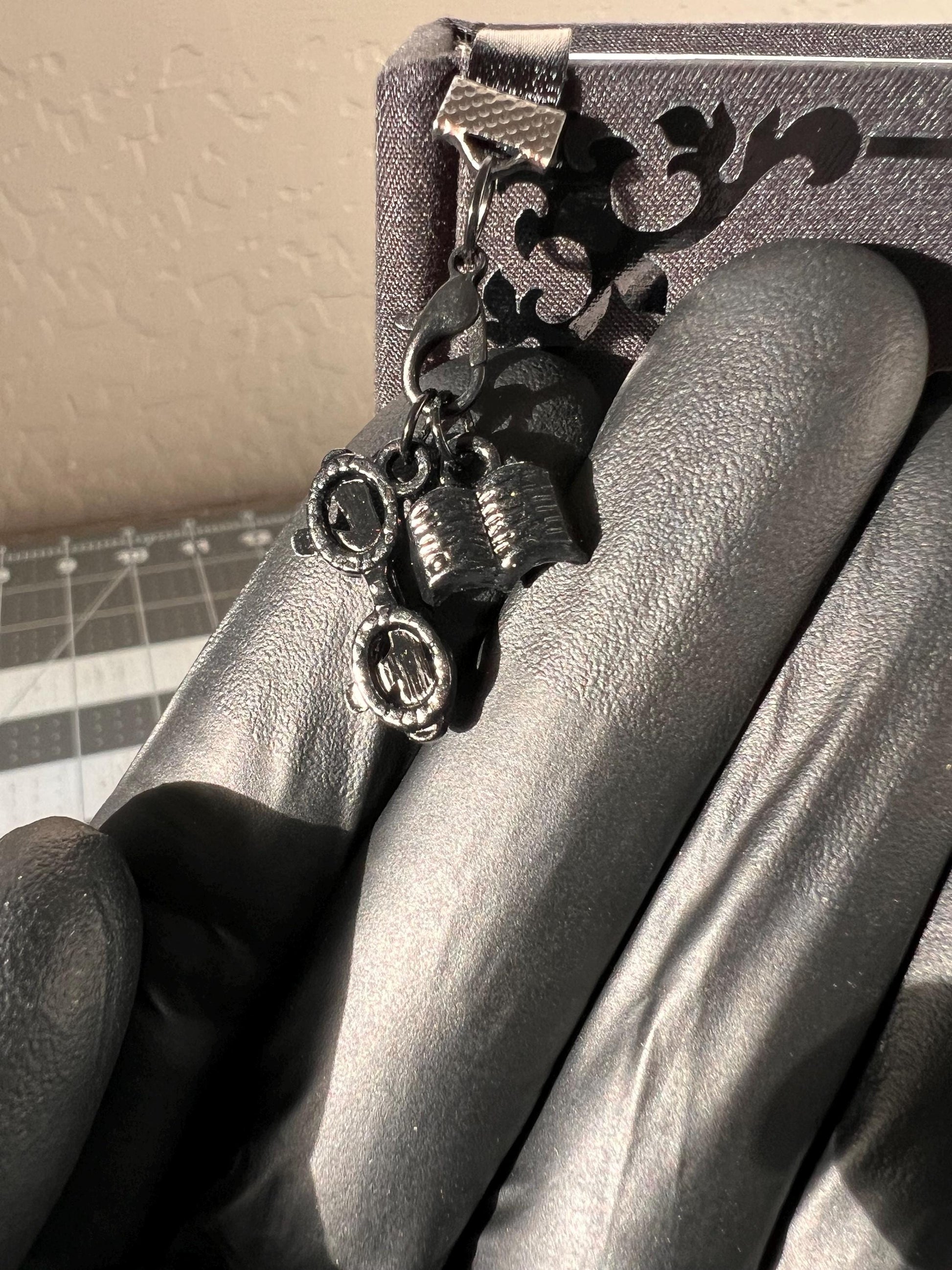 Immerse yourself in the wizarding world with this hand-bound, custom edition of Harry Potter and the Deathly Hallows, part of the Serious Black Collection. Designed in a striking, pure black aesthetic, this rebind features black book cloth and a black foiled cover design. The book includes a built-in bookmark adorned with black charms inspired by the series, black foiled endpapers, and black sprayed page edges inscribed with iconic spells from the Harry Potter universe.