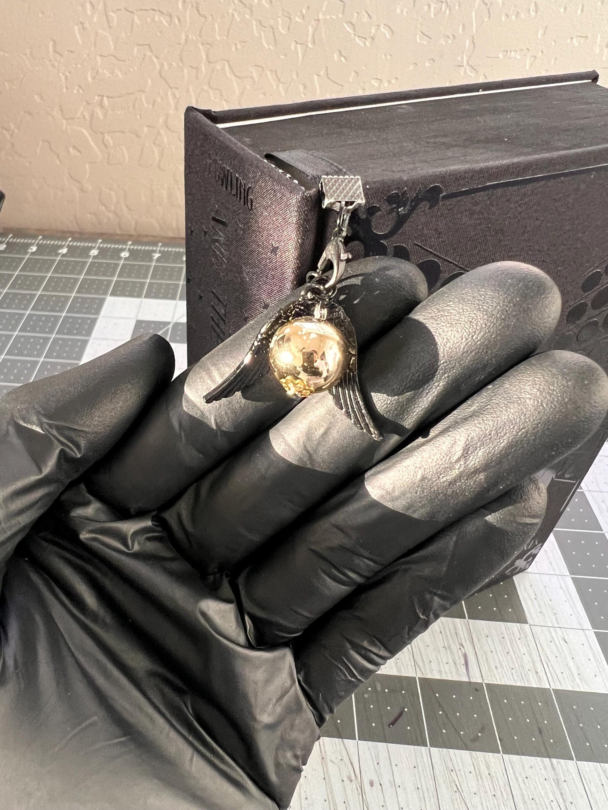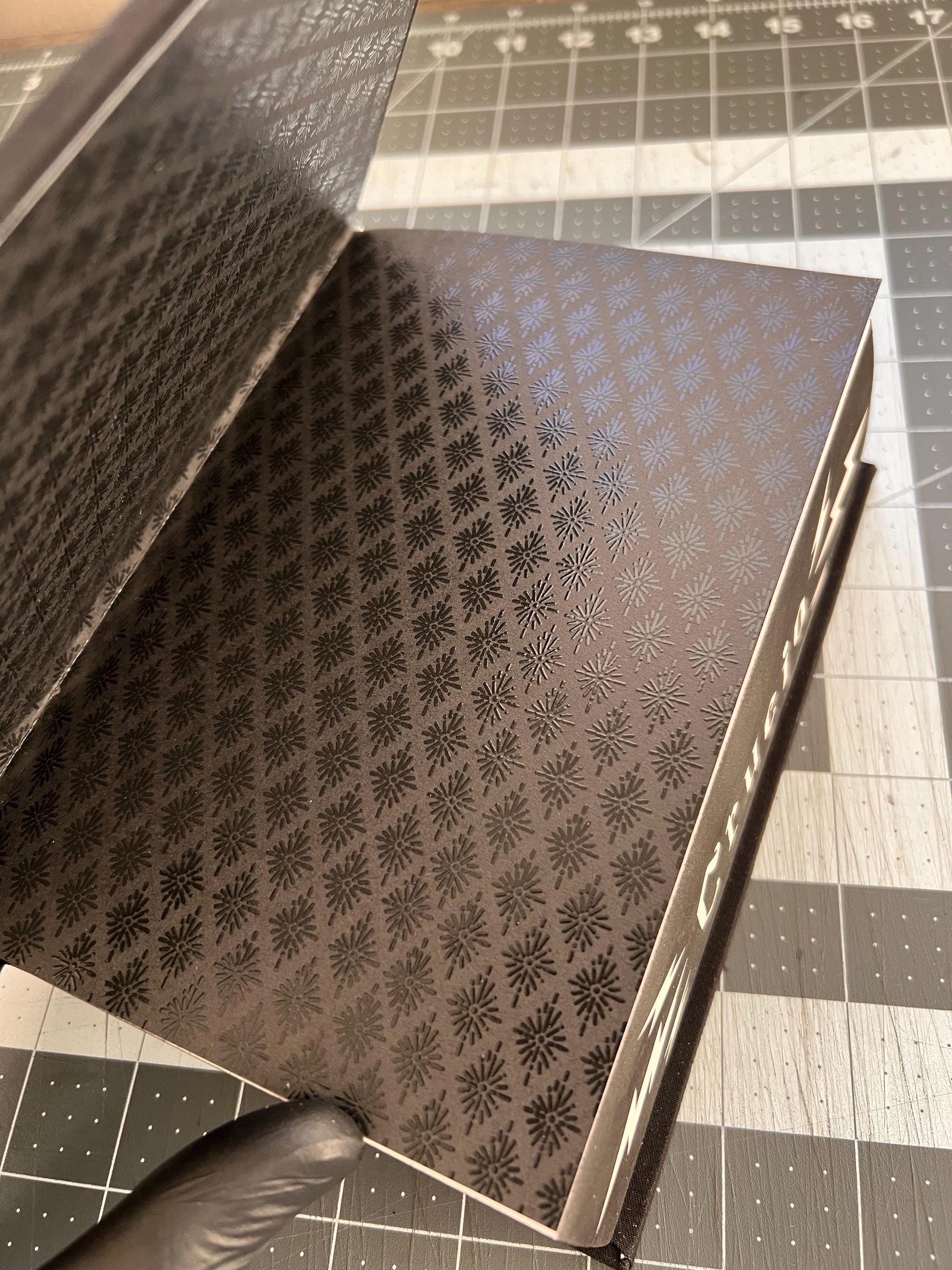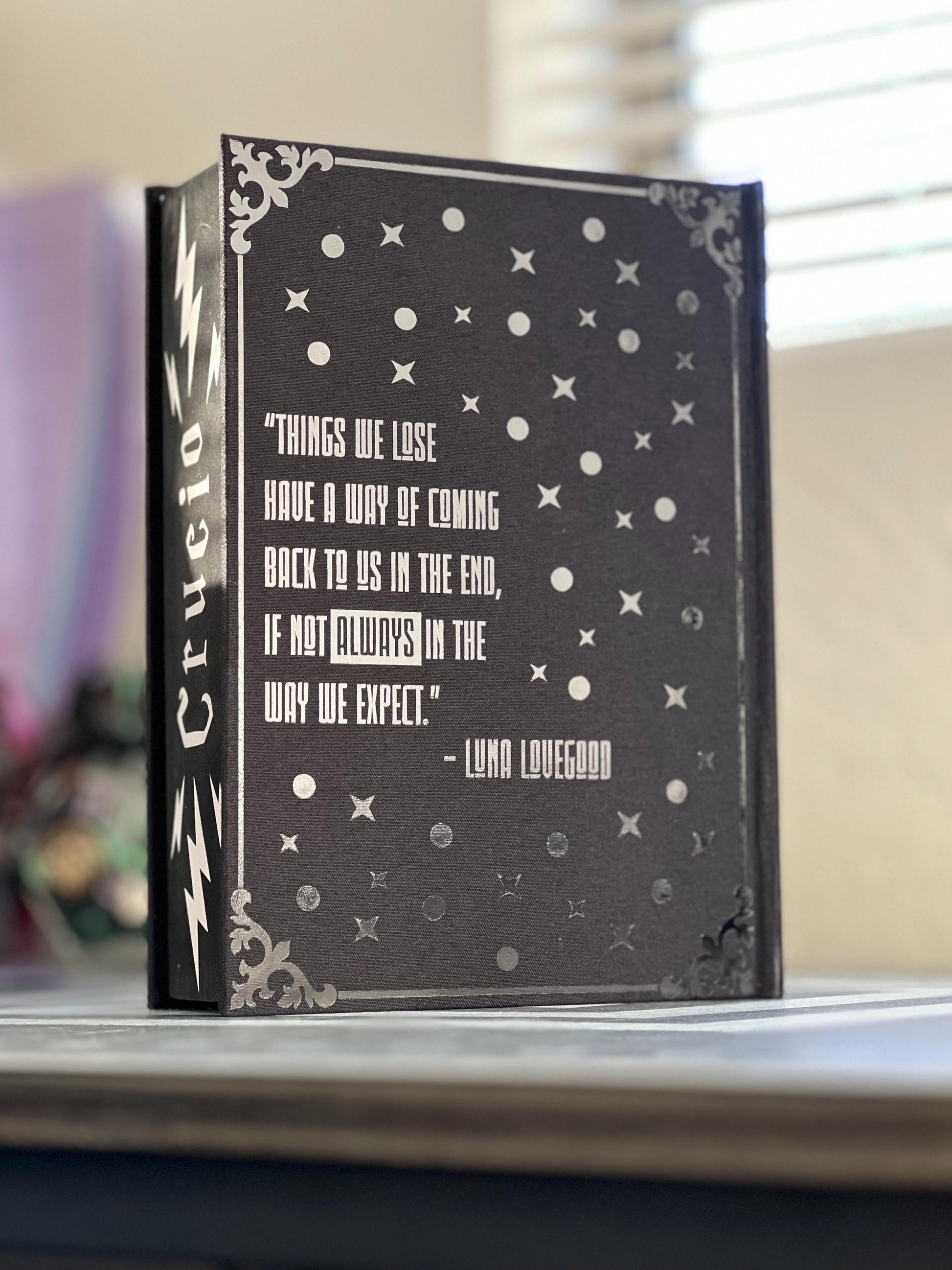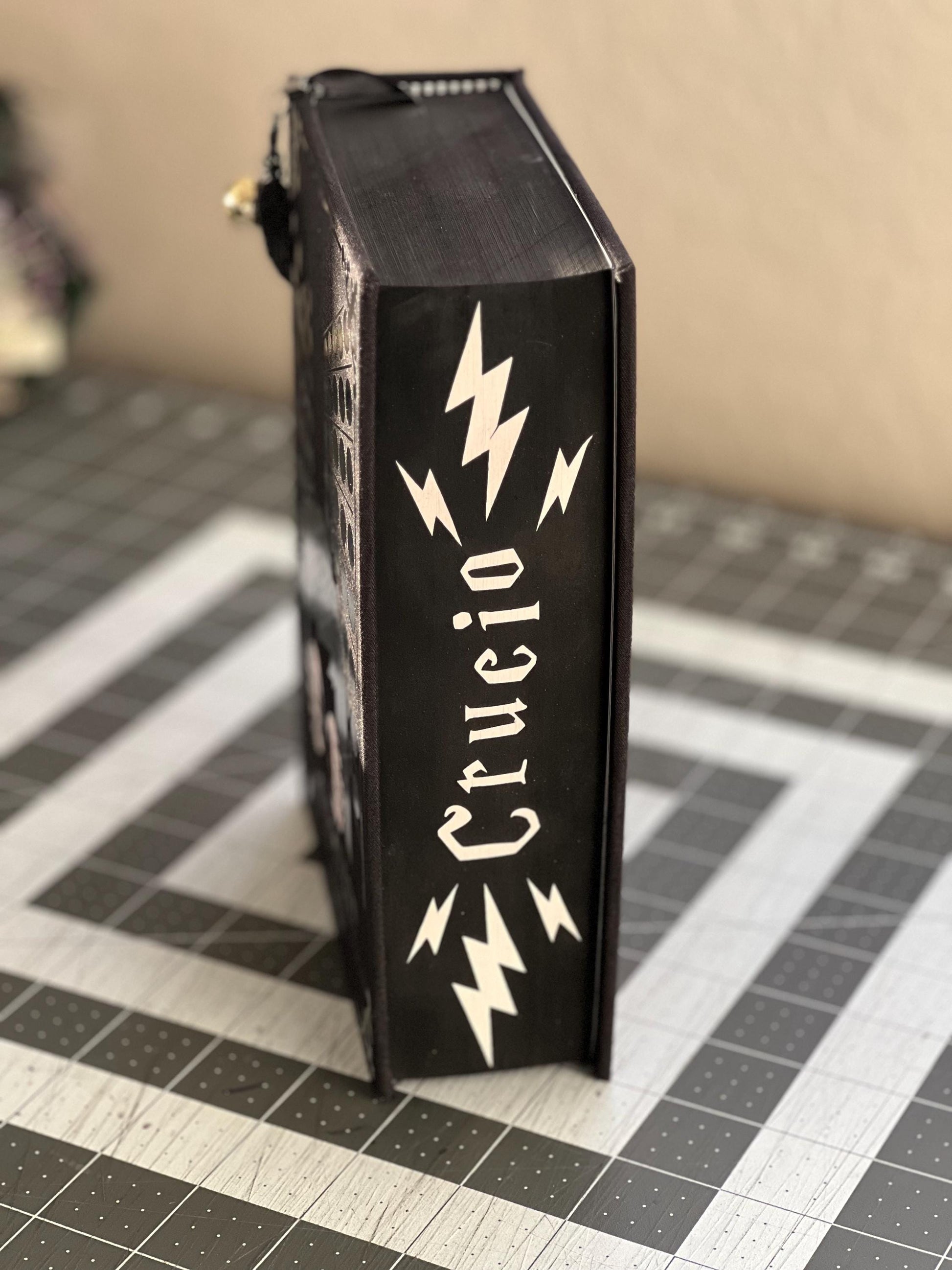 Immerse yourself in the wizarding world with this hand-bound, custom edition of Harry Potter and the Order of the Phoenix, part of the Serious Black Collection. Designed in a striking, pure black aesthetic, this rebind features black book cloth and a black foiled cover design. The book includes a built-in bookmark adorned with black charms inspired by the series, black foiled endpapers, and black sprayed page edges inscribed with iconic spells from the Harry Potter universe.