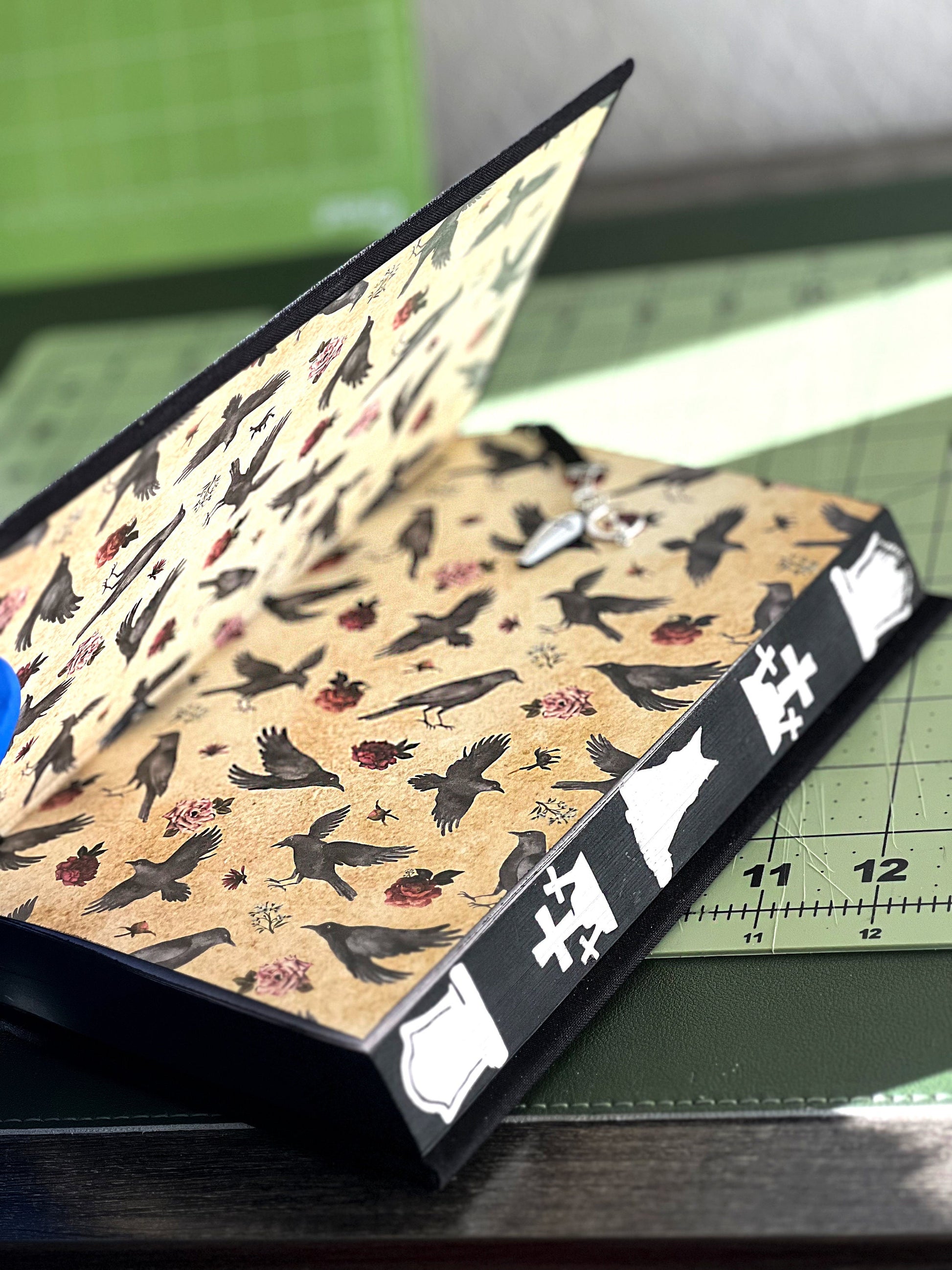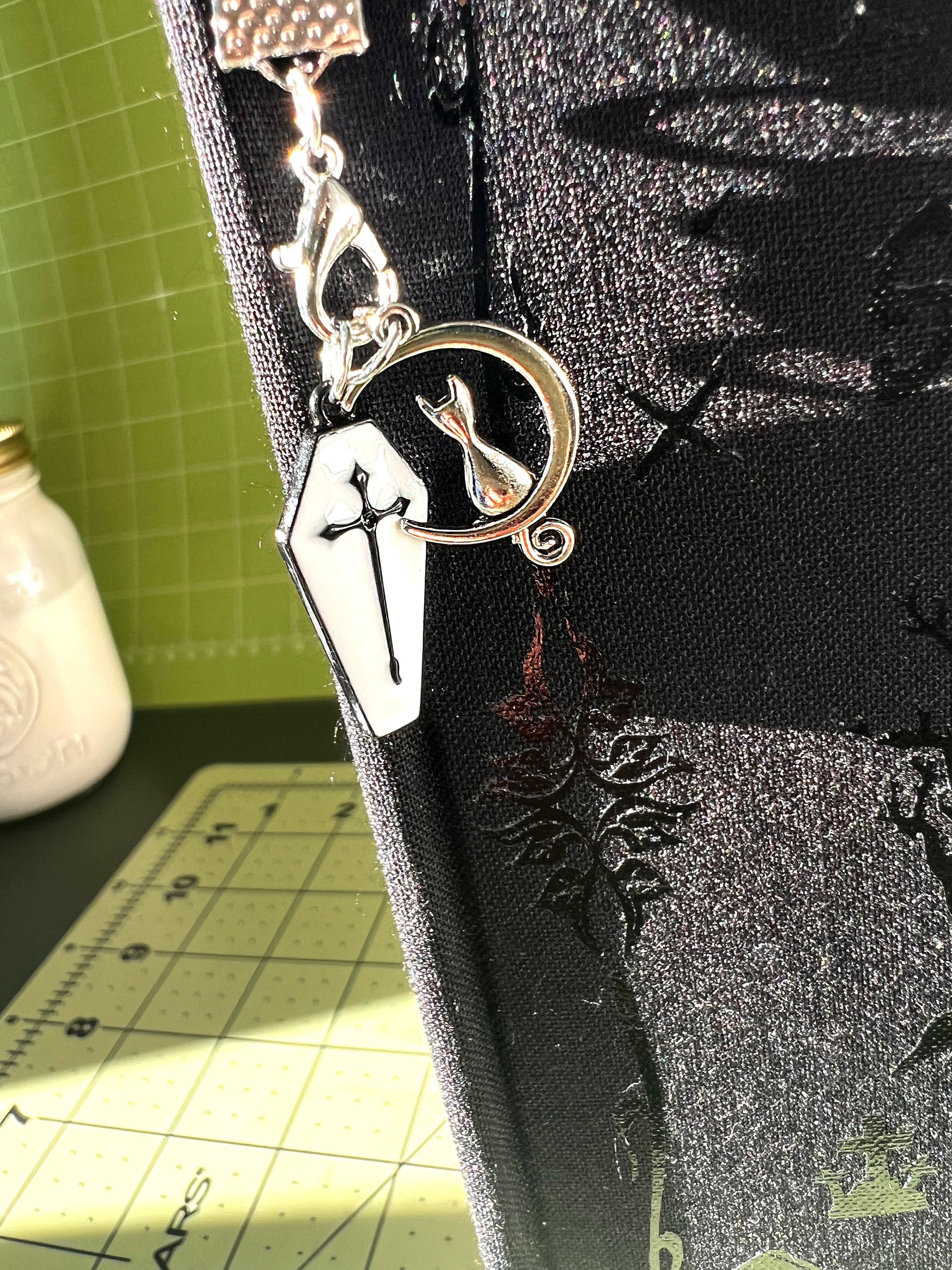 This hardcover book is rebound in textured book cloth and features semi-gloss custom end pages, a built-in onyx bookmark with dark charms (Charms and end pages will vary on supply), and hand-painted edges.