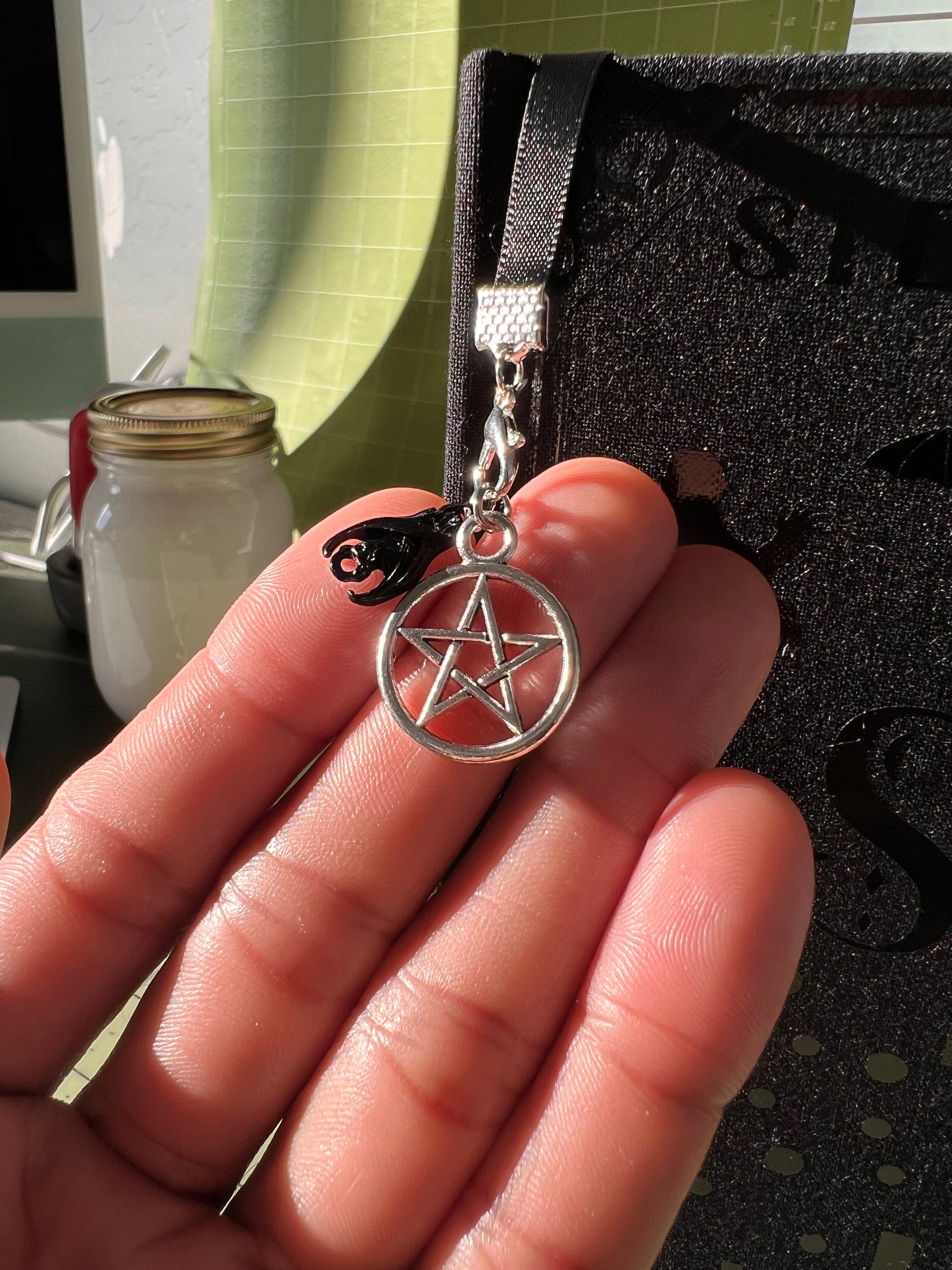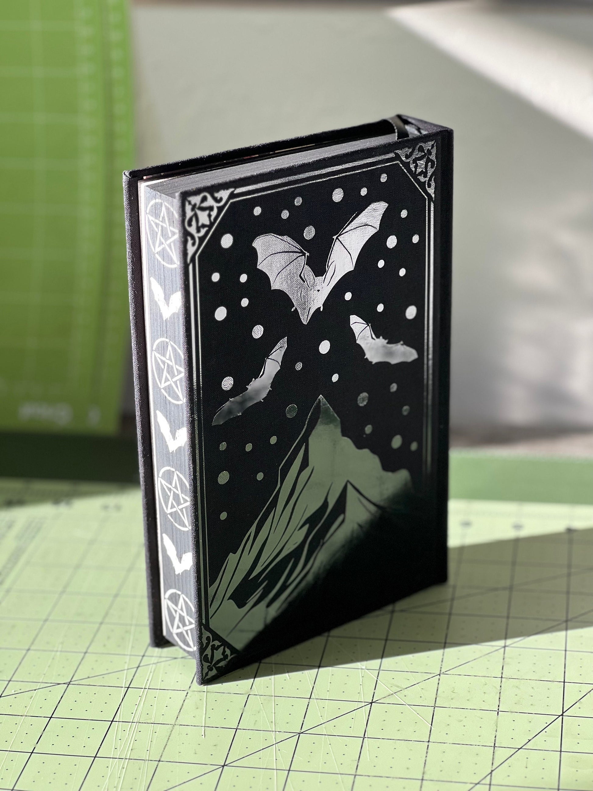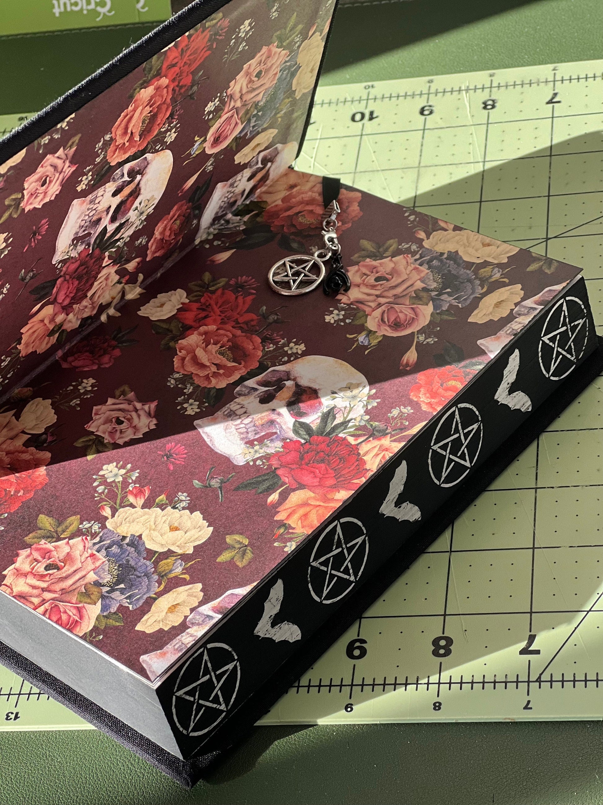 This hardcover book is rebound in textured book cloth and features semi-gloss custom end pages, a built-in onyx bookmark with dark charms, black foils (Charms and end pages will vary on supply), and hand-painted edges.