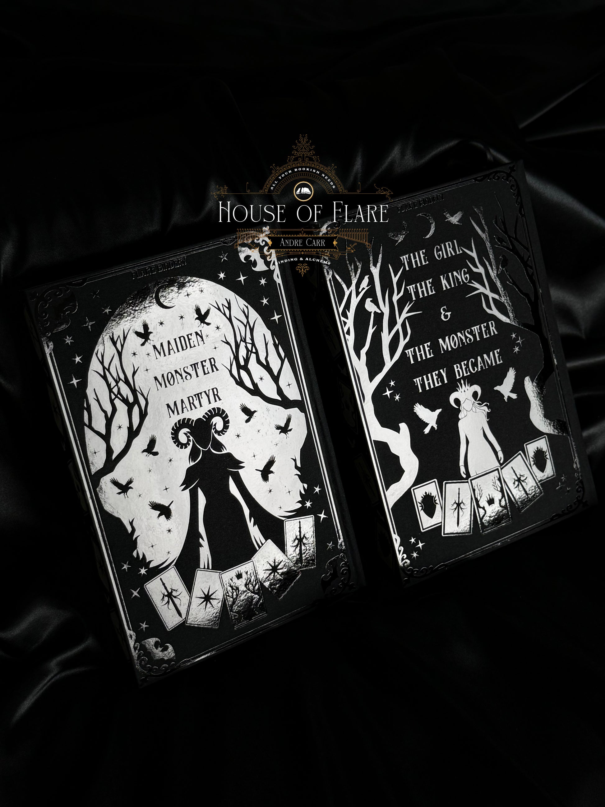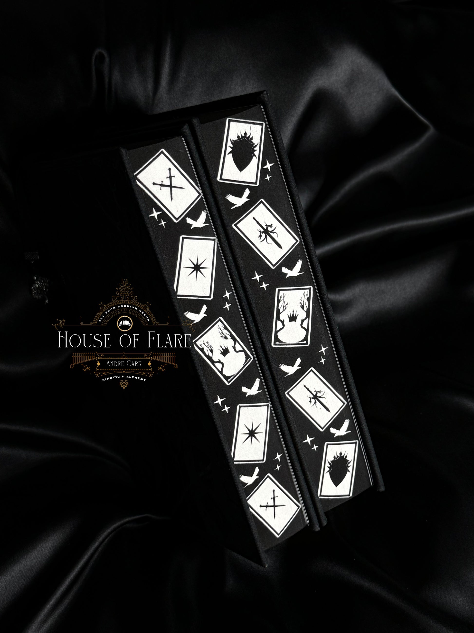For those who crave the allure of something more refined—this two-book rebound set captures the gothic beauty of the series. Bound in black book cloth, pressed with black foiled cover designs, and finished with black sprayed edges featuring the magical cards, these volumes are as mysterious as they are elegant. Each book holds a secret within: a built-in bookmark charm, one silver tree and one black, reflecting the story’s balance of light and shadow. This set arrives without a case—ready to be displayed or read as they are.