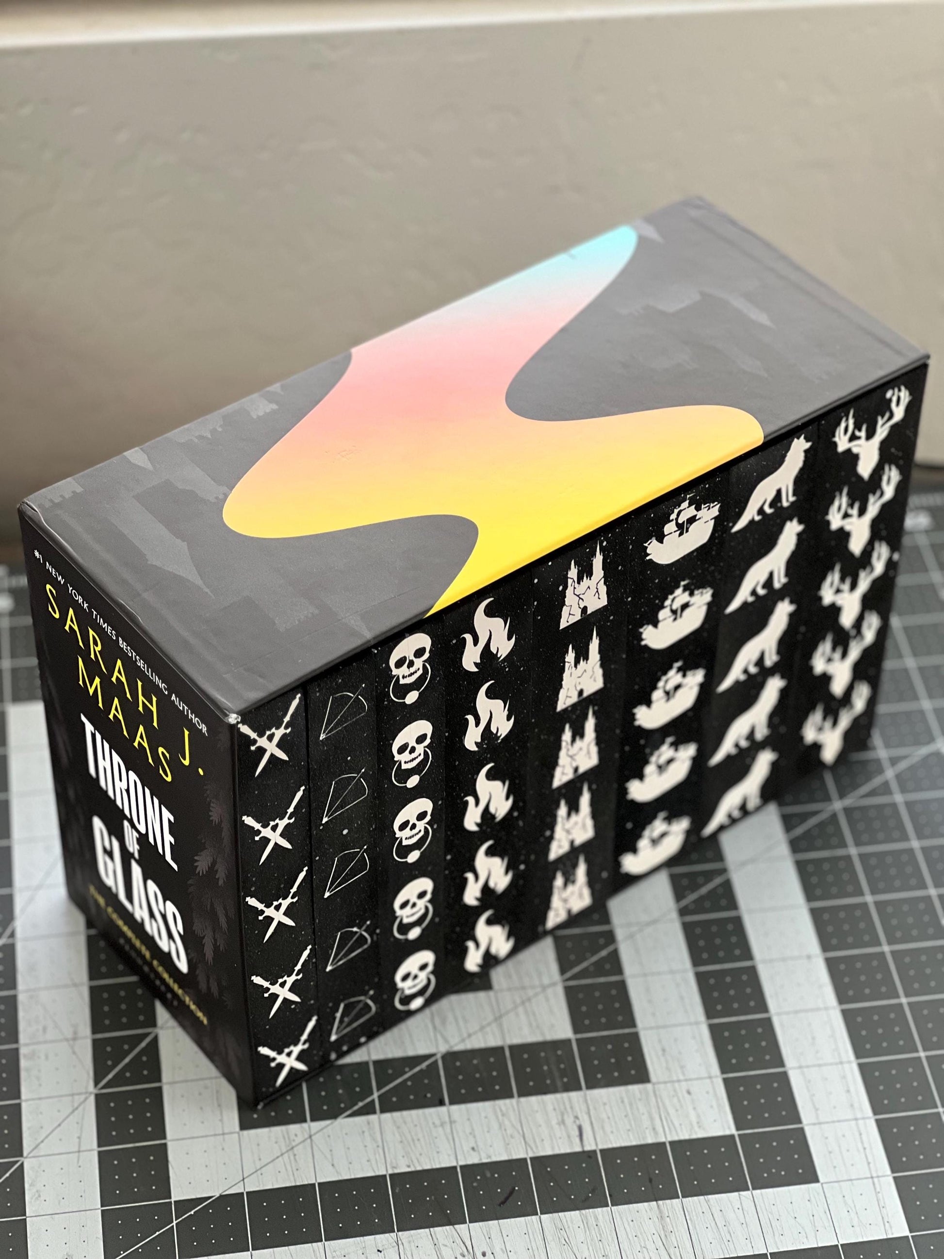 Step into the world of Erilea with this striking Throne of Glass Sprayed Edges Collection Set. Each book in the series has been transformed with sleek black sprayed edges adorned with iconic symbols that hold deep meaning throughout the story—from wyrdmarks to weapons, crowns, and other significant imagery. A delicate splatter of white speckling gives the edges a magical starlight effect, capturing the cosmic beauty of the series’ powerful themes and journeys.