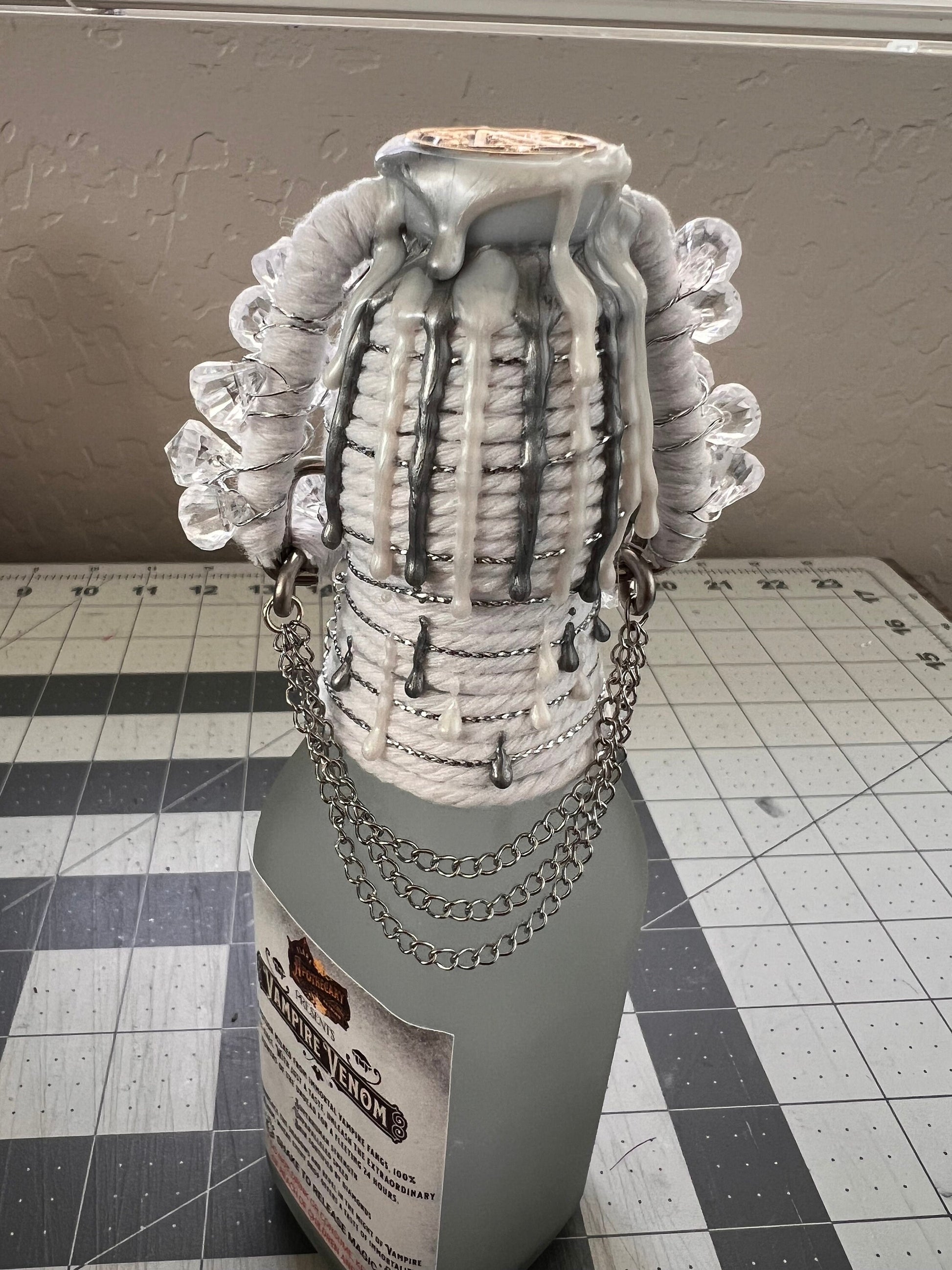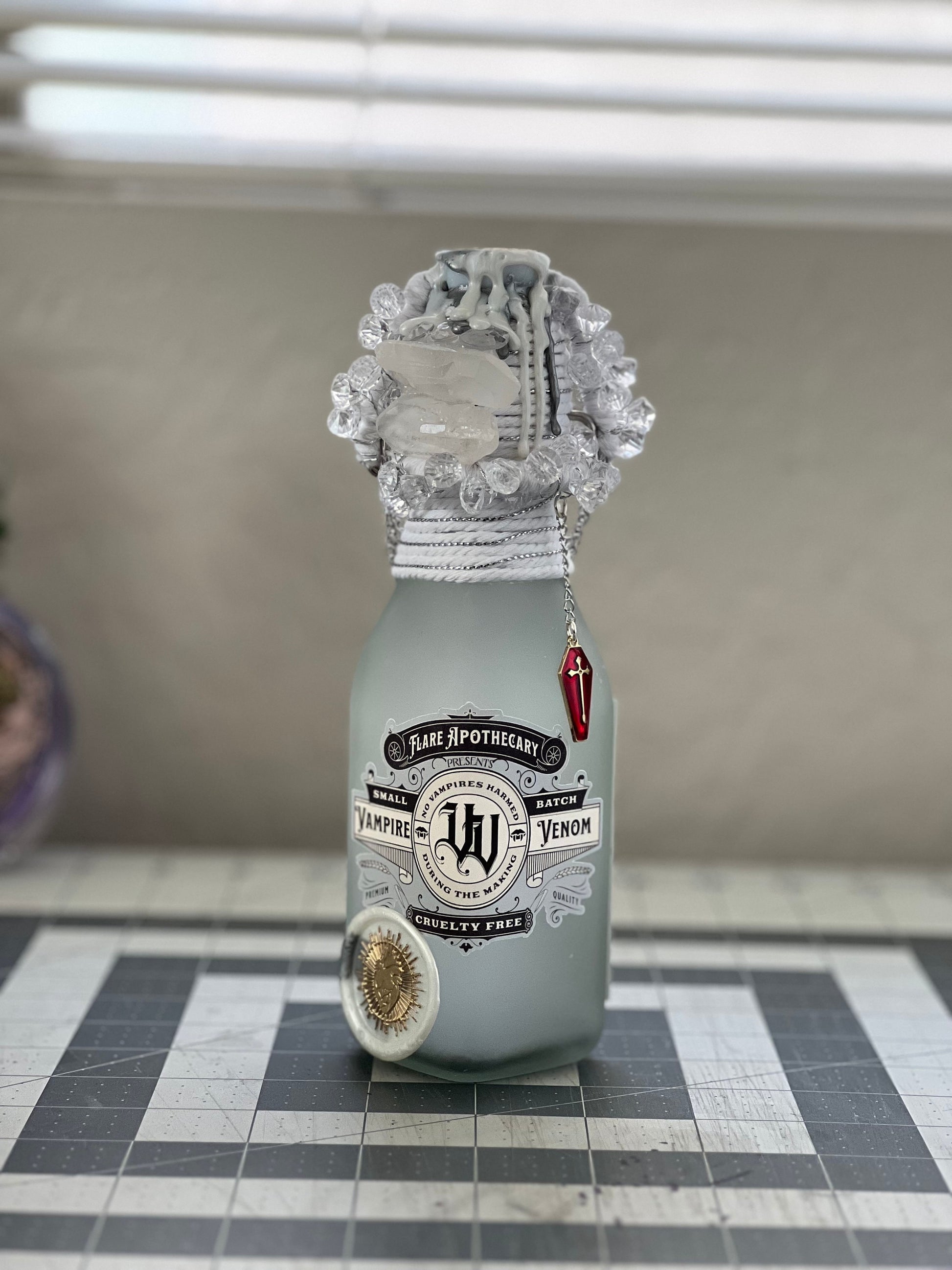 Flare Apothecary presents Vampire Venom. A potion milked from immortal Vampire fangs, 100% cruelty-free. With just a taste, unleash the extraordinary powers of the undead for a fleeting 24 hours. — Superhuman Strength — Unparalleled Speed — Skin Fortified by Diamonds Embrace the shadows and revel in the night of Vampire Venom, where every drop offers a taste of immortality. This is a handmade potion that is made for decoration only. DO NOT CONSUME OR ATTEMPT TO OPEN THE BOTTLE. KEEP OUT OF REACH OF CHILDREN AND PETS. Each potion is handmade and will vary slightly in appearance. Imperfections are minimal but may exist. *Disclaimer: This potion is intended solely for decorative purposes and is not suitable for consumption. This potion is designed for home decor and aesthetic enjoyment only. TikTok: F L A R E Instagram: F L A R E X: F L A R E